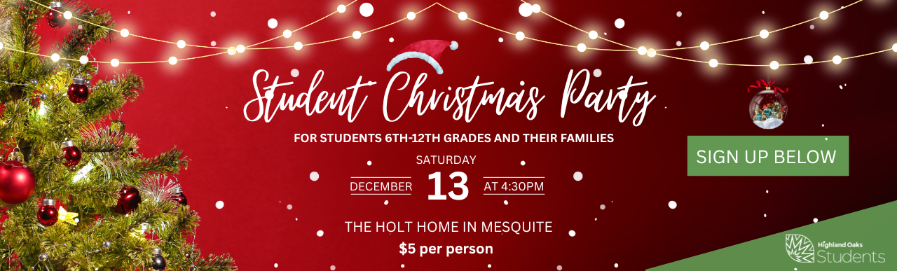 Students 6th-12th grade and their families are invited to the Student Christmas Party Saturday December 13th from 4:30-6:30 pm at the Holt Household in Mesquite, TX. Cost is $5 per person.